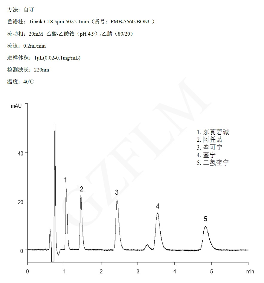 Titank C18有機(jī)硅膠雜化色譜柱,是在硅膠的硅氧網(wǎng)狀構(gòu)造中以更加穩(wěn)定的烷基來取代在堿性條件下不穩(wěn)定的硅氧橋連接,具有寬pH耐受范圍(1-12)、低背壓和100%水相穩(wěn)定的特點(diǎn),對于較大極性的物質(zhì)有很好的保留。下圖分別為幾種生物堿的分析、鹽酸小檗堿的有關(guān)物質(zhì)。