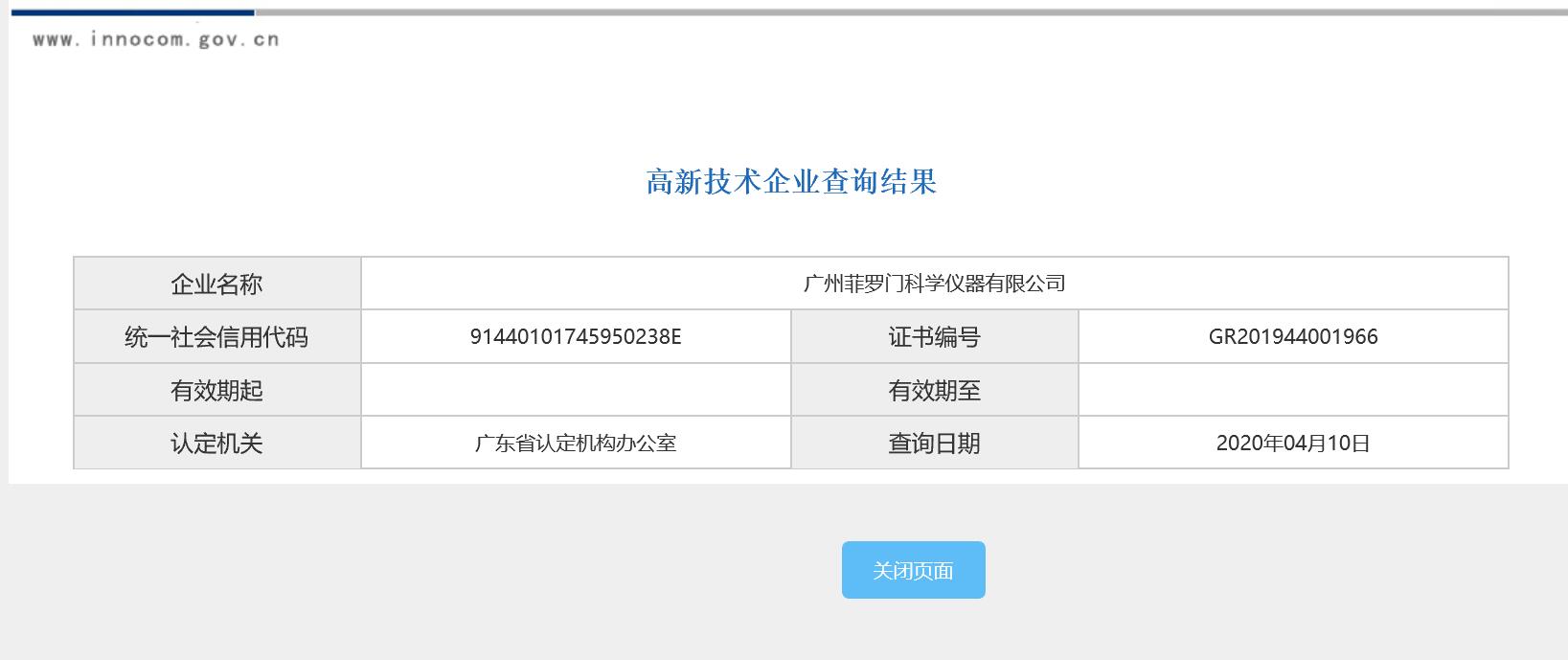 根據(jù)國家《高新技術企業(yè)認定管理辦法》和《高新技術企業(yè)認定管理工作指引》的相關規(guī)定,廣州菲羅門科學儀器有限公司被認定為國家級高新技術企業(yè)。 菲羅門高新企業(yè)證書編號:GR201944001966