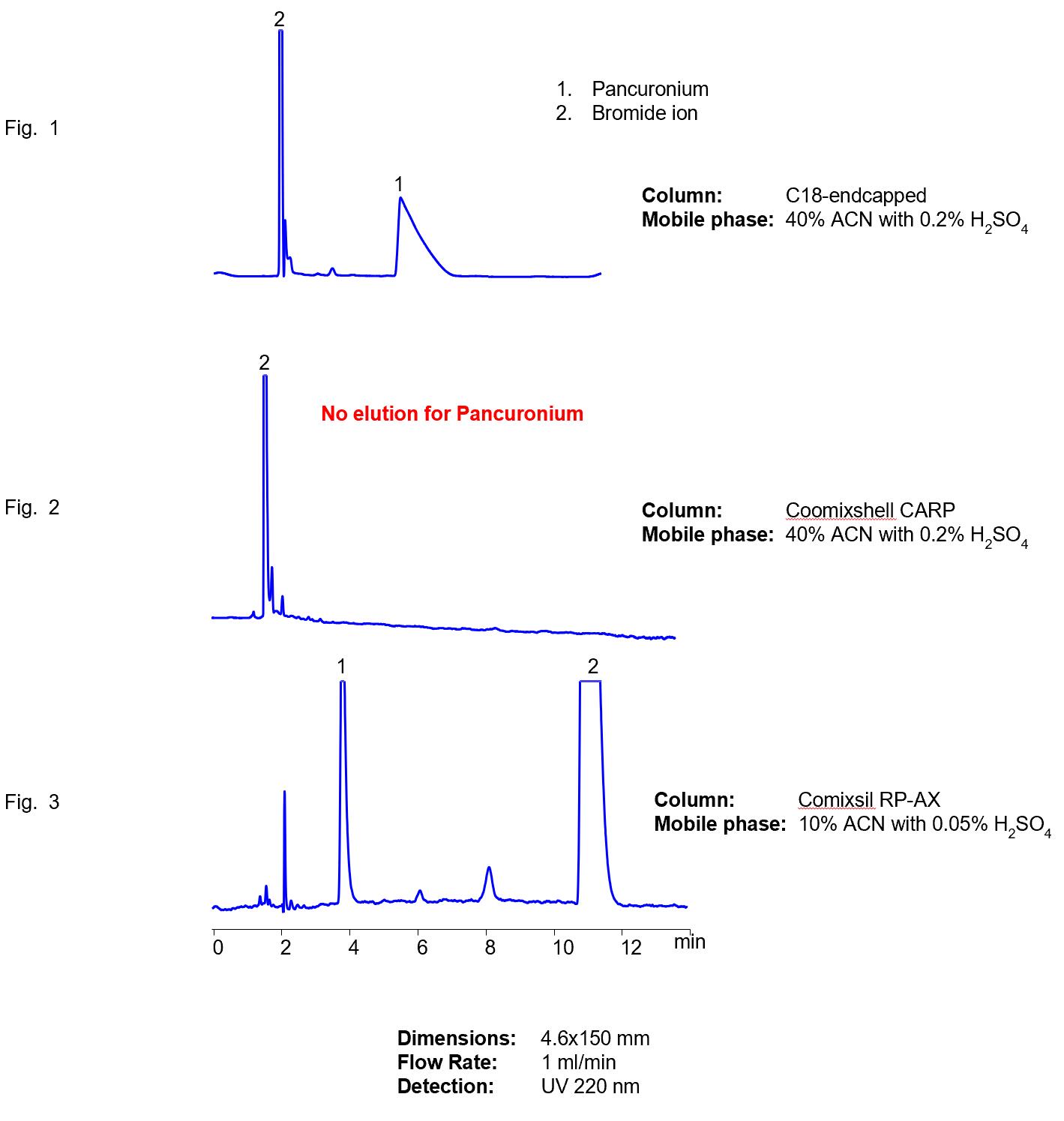 Mixed-mode chromatography usually adds secondary and tertiary interactions which help to achieve controlled retention, unique selectivity and allow to adjust retention time of various compounds by changing the amount of organic, buffer concentration, buffer pH and buffer nature(混合模式色譜法通常增添二重和三重相互作用,有助于實(shí)現(xiàn)可控的保留,獨(dú)特的選擇性,并通過改變有機(jī)溶劑的含量,緩沖濃度,緩沖pH值和緩沖鹽的性質(zhì)來調(diào)整各種化合物的保留時(shí)間。 ). Presence of ionizable groups on the column also helps improve peak shape for various analytes, which sometimes is impossible to achieve with single mode columns.(色譜柱上存在可電離基團(tuán)也有助于改善各種分析物的峰形,一些時(shí)候,這在單一模式色譜柱上是不可能實(shí)現(xiàn)的) Pancuronium bromide is a hydrophobic compound with two strong basic groups. It shows a poor peak shape when RP columns are used(泮庫溴銨是一種具有兩個(gè)強(qiáng)堿性基團(tuán)的疏水化合物。當(dāng)采用RP柱時(shí),峰形較差。). The poor peak shape is attributed to secondary interaction between analyte and silanols on the surface of RP columns (分析物與在RP柱表面的硅烷醇二次相互作用導(dǎo)致峰形較差) (Fig. 1). Sometimes you need to understand what secondary interaction to add to improve your chromatography(有時(shí),你需要了解增加什么樣的二次相互作用來改善你的色譜方法). In case of pancuronium bromide, addition of cation-exchange mechanism did not work and target compound never eluted, (Fig. 2) even with very strong mobile phase from the column due to three strong interactions (reversed-phase and two cation-exchange interactions)(在泮庫溴銨的例子下,添加陽離子交換機(jī)制不起作用,目標(biāo)化合物也沒有洗脫(圖2)。即使柱內(nèi)流動(dòng)相洗脫能力很強(qiáng),存在三種強(qiáng)烈的相互作用(反相作用和兩種陽離子交換作用),化合物也沒有得到保留.)Problem of elution and peak shape was addressed by changing cation-exchange interaction to cation-exclusion interaction. This allowed to retain and analyze both the drug and counterion with simple isocratic conditions (Fig. 3)(通過將陽離子交換相互作用轉(zhuǎn)變?yōu)殛栯x子排斥相互作用,解決了洗脫和峰形問題。這樣就可以在簡(jiǎn)單的等度條件下保留和分析藥物和反離子).