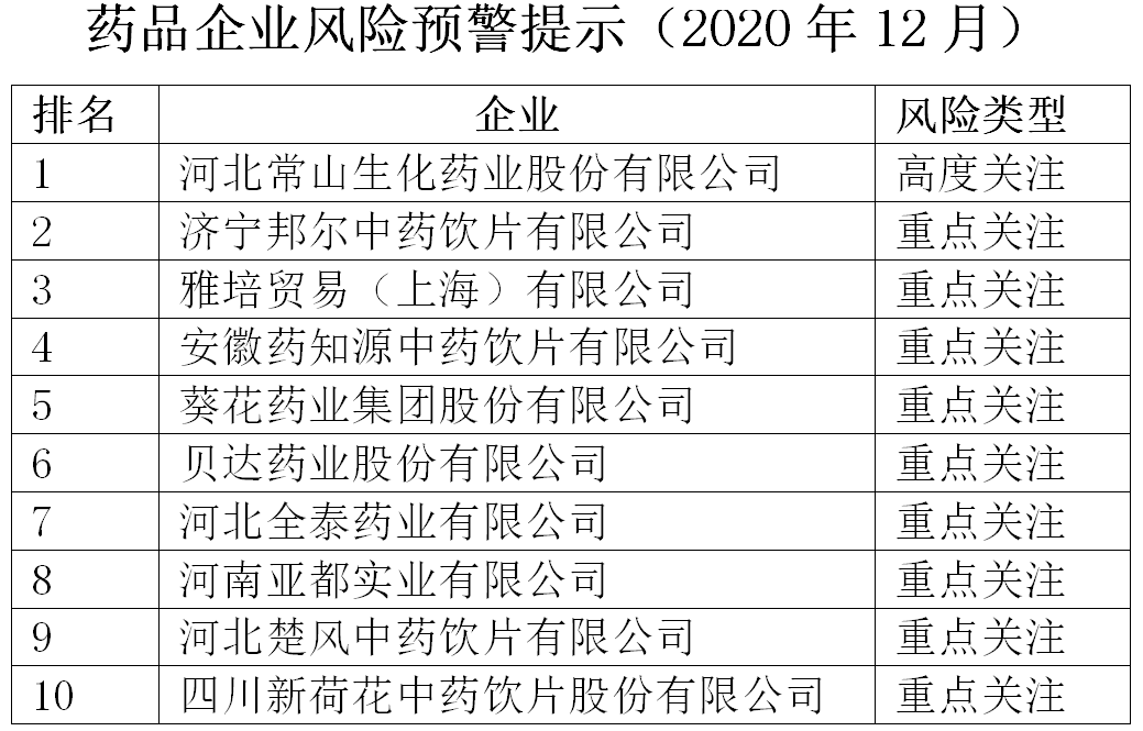 近日,中國健康傳媒集團輿情監(jiān)測中心發(fā)布藥品企業(yè)風險預警提示(2020年12月),公開風險指數(shù)排名前十的企業(yè)。河北常山生化藥業(yè)股份有限公司(以下簡稱常山藥業(yè))排名第一,為“高度關(guān)注企業(yè)”;濟寧邦爾中藥飲片有限公司、雅培貿(mào)易(上海)有限公司、安徽藥知源中藥飲片有限公司、葵花藥業(yè)集團股份有限公司、貝達藥業(yè)股份有限公司、河北全泰藥業(yè)有限公司、河南亞都實業(yè)有限公司、河北楚風中藥飲片有限公司、四川新荷花中藥飲片股份有限公司分列第2至10位,為“重點關(guān)注企業(yè)”。