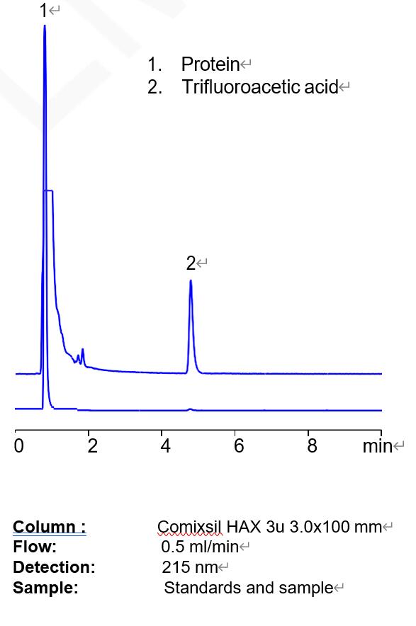 說明:此方法同時適合多肽中TFA殘留量的測定。多肽的出峰時間將于蛋白相似或更早, 都不會干擾TFA的定量。此外,UV下的分析,也可采用Comixsil HAX 3u 100*4.6mm
