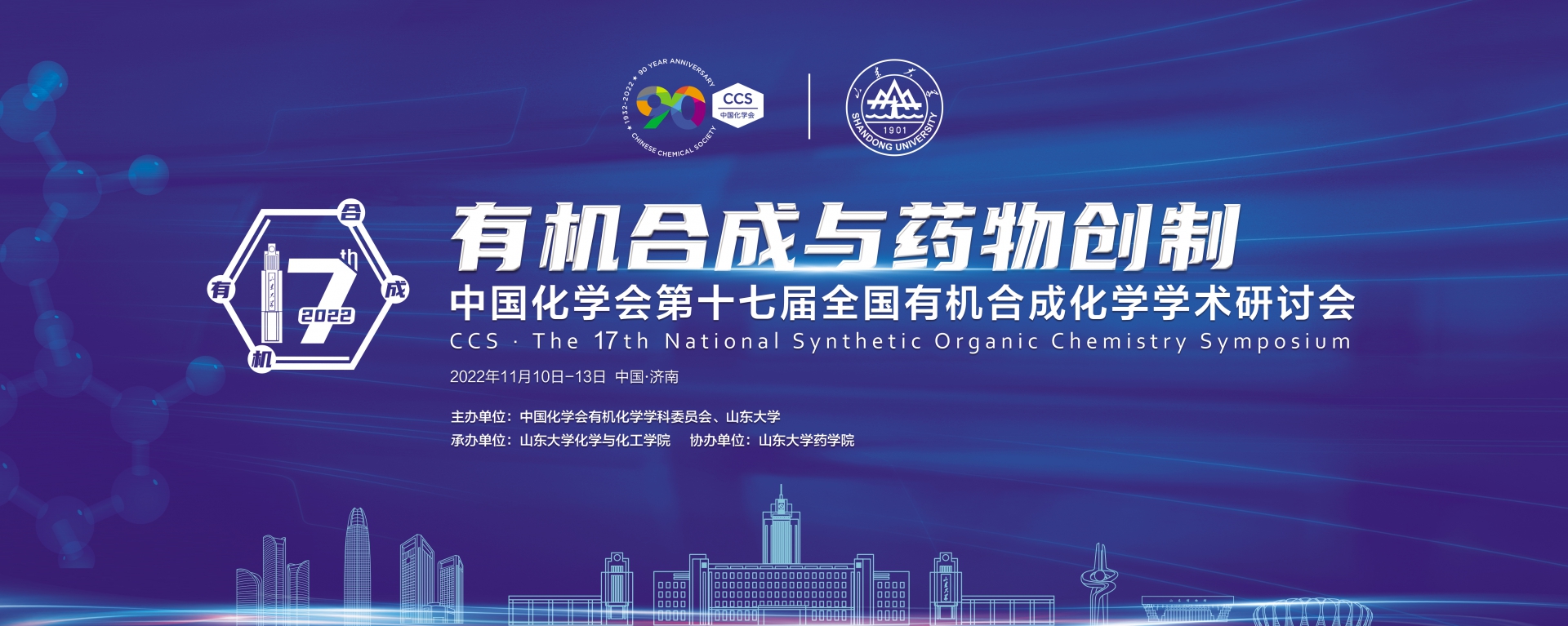 中國化學(xué)會第十七屆全國有機合成化學(xué)學(xué)術(shù)研討會定于2022年11月10至13日在山東省濟南市舉行。本次會議由中國化學(xué)會有機化學(xué)學(xué)科委員會、山東大學(xué)共同主辦,山東大學(xué)化學(xué)與化工學(xué)院承辦,山東大學(xué)藥學(xué)院協(xié)辦。