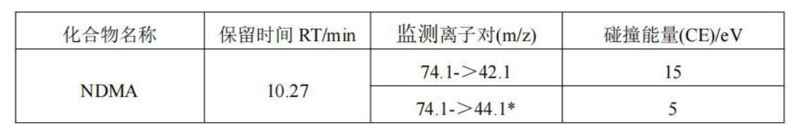 NDMA 監(jiān)測(cè)參數(shù)表(*為定量離子)