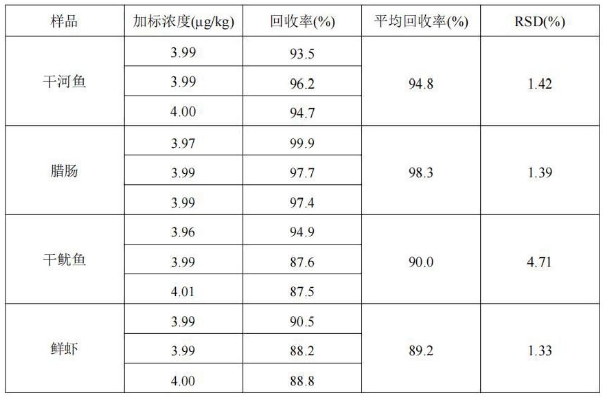 菲羅門按照 GB 5009.26-2023 標(biāo)準(zhǔn),采用 Quchers 凈化,并用 GC-MS/MS 外標(biāo)法定量,分別對(duì)干河魚、臘腸、干魷魚、鮮蝦進(jìn)行了加標(biāo)回收試驗(yàn),NDMA 回收率均在 85 %以上,RSD 小于 5 %。