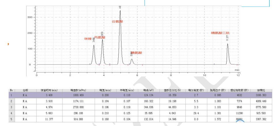 1. 咪唑的檢測(cè): * 咪唑的檢測(cè)通常依據(jù)《咪唑產(chǎn)品測(cè)試方法及技術(shù)要求》這一行業(yè)標(biāo)準(zhǔn)進(jìn)行。該標(biāo)準(zhǔn)規(guī)定了咪唑的理化指標(biāo)、試驗(yàn)方法、檢驗(yàn)規(guī)則以及包裝、運(yùn)輸、貯存的要求。具體的檢測(cè)方法可能包括使用高效液相色譜法(HPLC)或氣相色譜法(GC)對(duì)其純度、含量以及雜質(zhì)進(jìn)行檢測(cè)。 2. 谷氨酸的檢測(cè): * 谷氨酸的檢測(cè)一般通過(guò)血液樣本進(jìn)行。在檢測(cè)前,需要注意避免攝入油膩、高蛋白食物和飲酒,同時(shí)保持放松狀態(tài)。檢測(cè)過(guò)程中,可能通過(guò)抽血后對(duì)血液含量進(jìn)行化學(xué)分析來(lái)測(cè)定谷氨酸的水平。 3. 丙氨酸的檢測(cè): * 丙氨酸的檢測(cè)可以采用高效液相色譜法(HPLC)或氨基酸分析儀法。高效液相色譜法通過(guò)蛋白酶催化樣品中的丙氨酸與衍生劑反應(yīng),然后利用高效液相色譜儀進(jìn)行分離和定量。氨基酸分析儀法則是通過(guò)酸水解樣品中的蛋白質(zhì),將其轉(zhuǎn)化為游離氨基酸,再經(jīng)過(guò)離子交換柱分離和可見(jiàn)光分光光度檢測(cè)器進(jìn)行定量。 4. 精氨酸的檢測(cè): * 精氨酸的檢測(cè)常用色譜法,包括薄層色譜法、高效液相色譜法和紅外光譜法等。這些方法能夠有效地分離和鑒定精氨酸,并對(duì)其進(jìn)行定量分析。 App ID: FLM-C240004 Comixsil HCS 混合柱對(duì)咪唑、谷氨酸、丙氨酸與精氨酸的檢測(cè)(適配 LC-MS) 方法:自定 色譜柱:Comixsil HCS 3μm 100×3.0 mm (貨號(hào):FMD-HCS3-YONU) 流速:0.6 mL/min 檢測(cè):ELSD, 45oC 進(jìn)樣量:5 μL 柱溫:25℃ 流動(dòng)相 A: 乙腈 B: 100mM 甲酸銨溶液(pH3.0)
