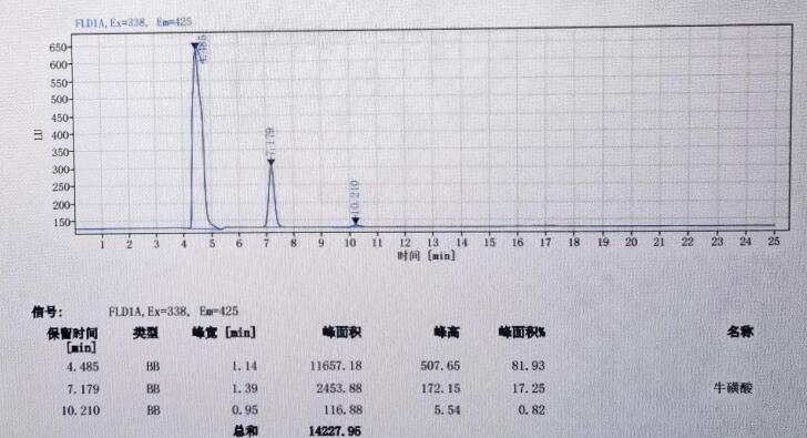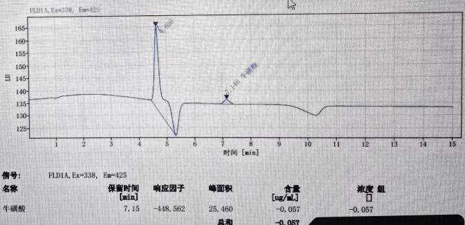 App ID: FLM-M240001 GB 5009.169-2016 食品中牛磺酸的測定 色譜柱:MARS MNa 5u,250*4.6mm(貨號:FMG-1036-EONU) 流動相:檸檬酸三鈉溶液(稱取19.6g 檸檬酸三鈉,加950mL 水溶解,加入1mL 苯酚,用硝酸調pH 至3.10-3.25, 經 0.45um 微孔濾膜過濾。 流速:0.4mL/min 熒光衍生溶劑流速:0.3mL/min 檢測波長:激發(fā)波長:338nm, 發(fā)射波長:425nm 柱溫:55℃ 柱后衍生系統(tǒng):SSI Allchrom PCR6000 柱后衍生系統(tǒng) 檢測器:熒光檢測器進樣量:20ul 樣品: