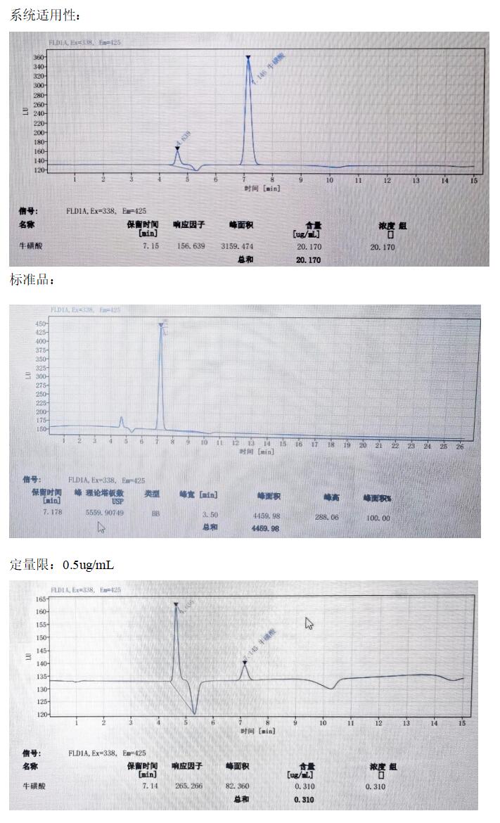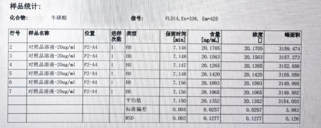 用牛磺酸標樣做重現(xiàn)性實驗,用 20ug/mL 濃度的標樣 6 針,其保留時間的相對標準偏差(RSD)是 0.062%, 峰面積的相對標準偏差(RSD)是 0.126%。