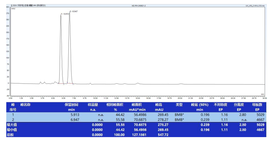 App ID: FLM-B240008 Chiral MZ(2)-RH 手性柱對(duì)阿瑞匹坦對(duì)映異構(gòu)體檢測(cè) 方法:自定 色譜柱:Chiral MZ(2)-RH 5u 250*4.6mm (貨號(hào):FMG-AC5-B02-R) 流速:0.8 mL/min 檢測(cè):UV210nm, 25oC 樣品濃度:1 mg/mL 進(jìn)樣量:3 μL 溶劑:異丙醇 色譜圖: