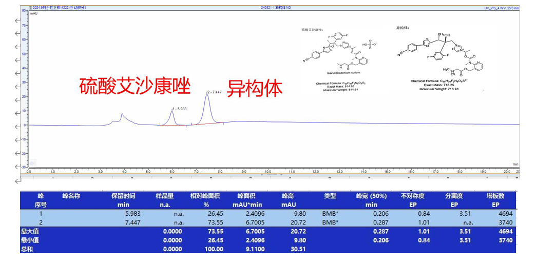 App ID: FLM-B240015 硫酸艾沙康唑及其對映異構(gòu)體的手性拆分 色譜柱:Chiral ND(2) 5u 250*4.6mm (P/N: FMG-AC5-A01-NFC) 流動相:正相(咨詢) 柱溫:25℃ 流速:0.8 mL/min 檢測波長:275nm 濃度:N/A 溶劑:30%乙腈 圖譜 1: