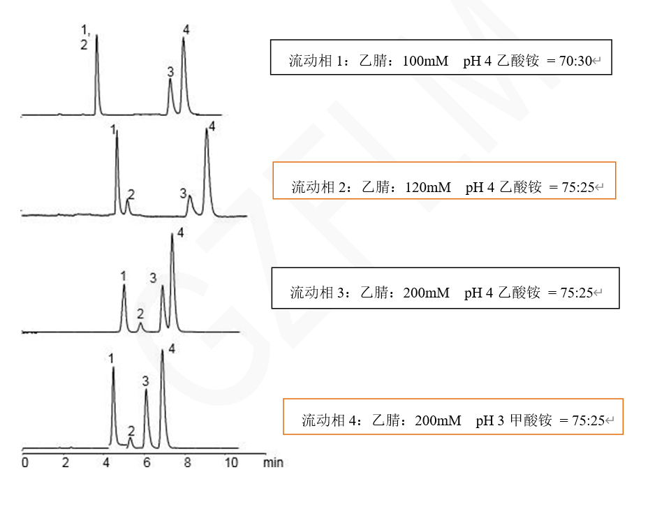說明:本案例中乙腈比例及緩沖鹽種類和強度的變化帶來磷霉素與庶糖的0分離到完全分離的變化, 以及保留時間上的變化。類似的雜質(zhì)也可通過此類調(diào)整或者梯度調(diào)整條件,實現(xiàn)分離。 在液相中同時分析磷霉素、蔗糖、氨丁三醇及鈉離子是一個復雜的過程,因為這四種物質(zhì)在化學性質(zhì)、極性和保留行為上可能存在顯著差異。以下是一種可能的分析策略: