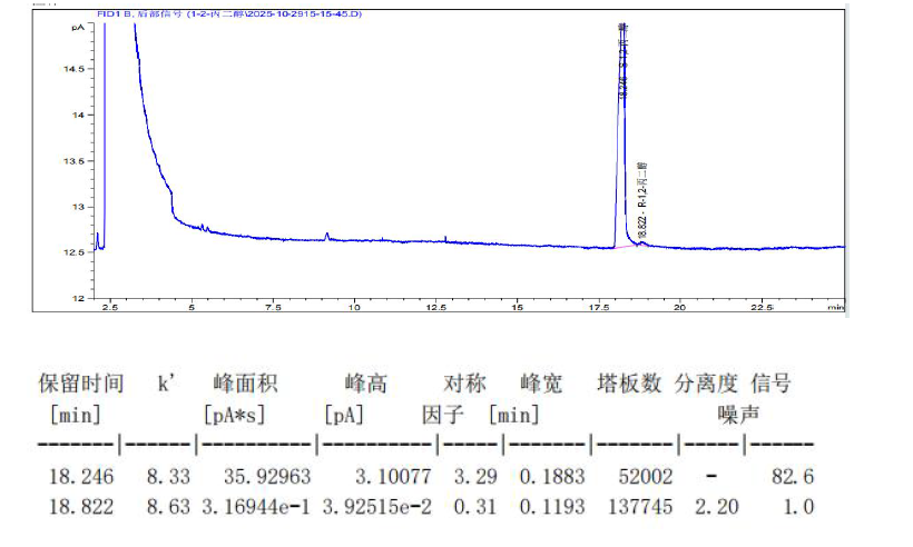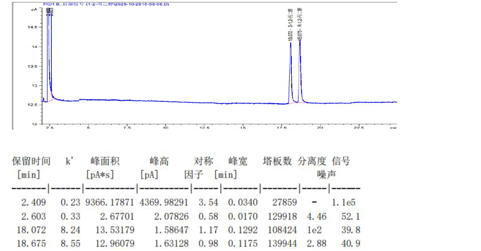 說明: 采用FBX-DEX DET Gamma 30m×0.25mm×0.25μm 手性氣相柱,可以成分分離(S)-1,2-丙二醇和 (R)-1,2-丙二醇,分離度良好。而后出峰的(R)-1,2-丙二醇,如果作為0.1%檢出限的考察, 也完全分離。如需更大分離度,也可自行考慮FBX-DEX DET Gamma 60m×0.25mm×0.25μm 手性氣 相柱。 |