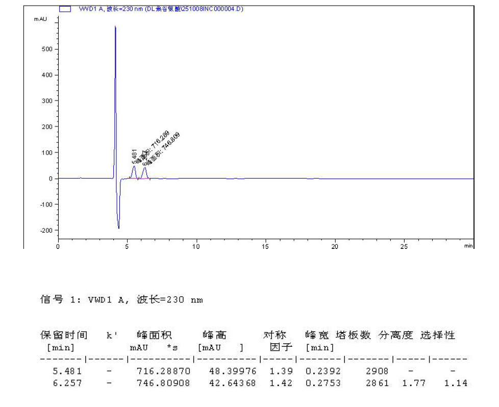 App ID: FLM-B250021 DL-焦谷氨酸的手性分析 方法:自定 色譜柱:Chiral INC 5μm 250×4.6 mm 貨號:FMG-JY5-I03 流速:0.6 mL/min 檢測:UV230nm 樣品濃度:1 mg/mL 進(jìn)樣量:2 μ 流動相:咨詢 色譜圖: