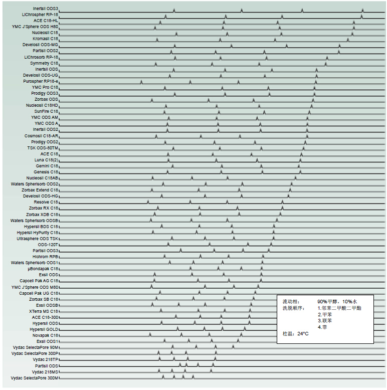 需要注意,依據(jù)對(duì)甲苯的保留順序列出的C18相與依據(jù)對(duì)菲的保留順序列出的C18相略有不同。