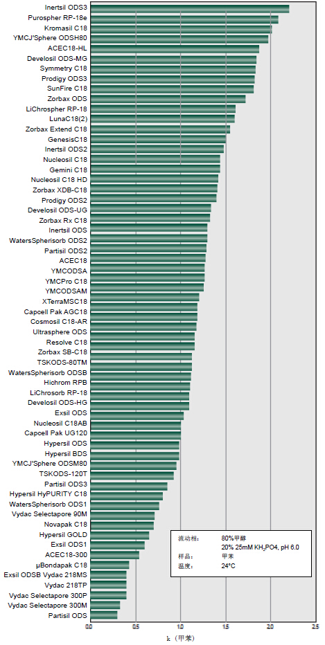 下圖給出了根據(jù)疏水性列出的C18相的疏水性比較。