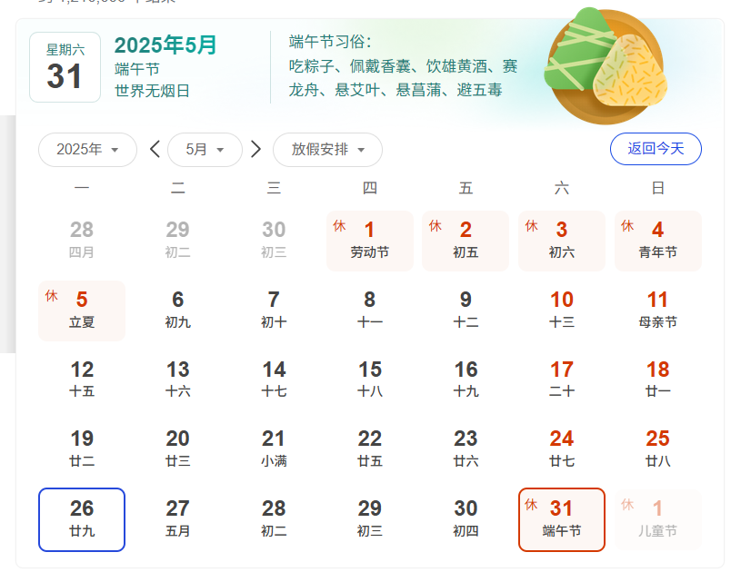 我司端午節(jié)放假時間為2025年5月31日至6月2日放假,共3天。