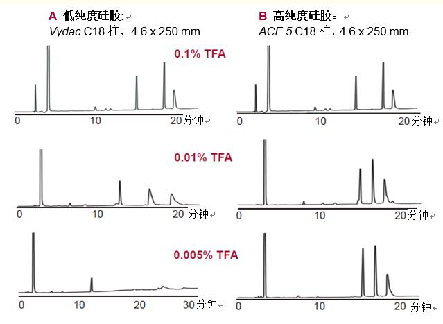 圖7. 硅膠純度會影響多肽的峰形,尤其是加入的離子對試劑濃度較低時。高純度硅膠所需離子對試劑的濃度遠(yuǎn)比低純度硅膠低。