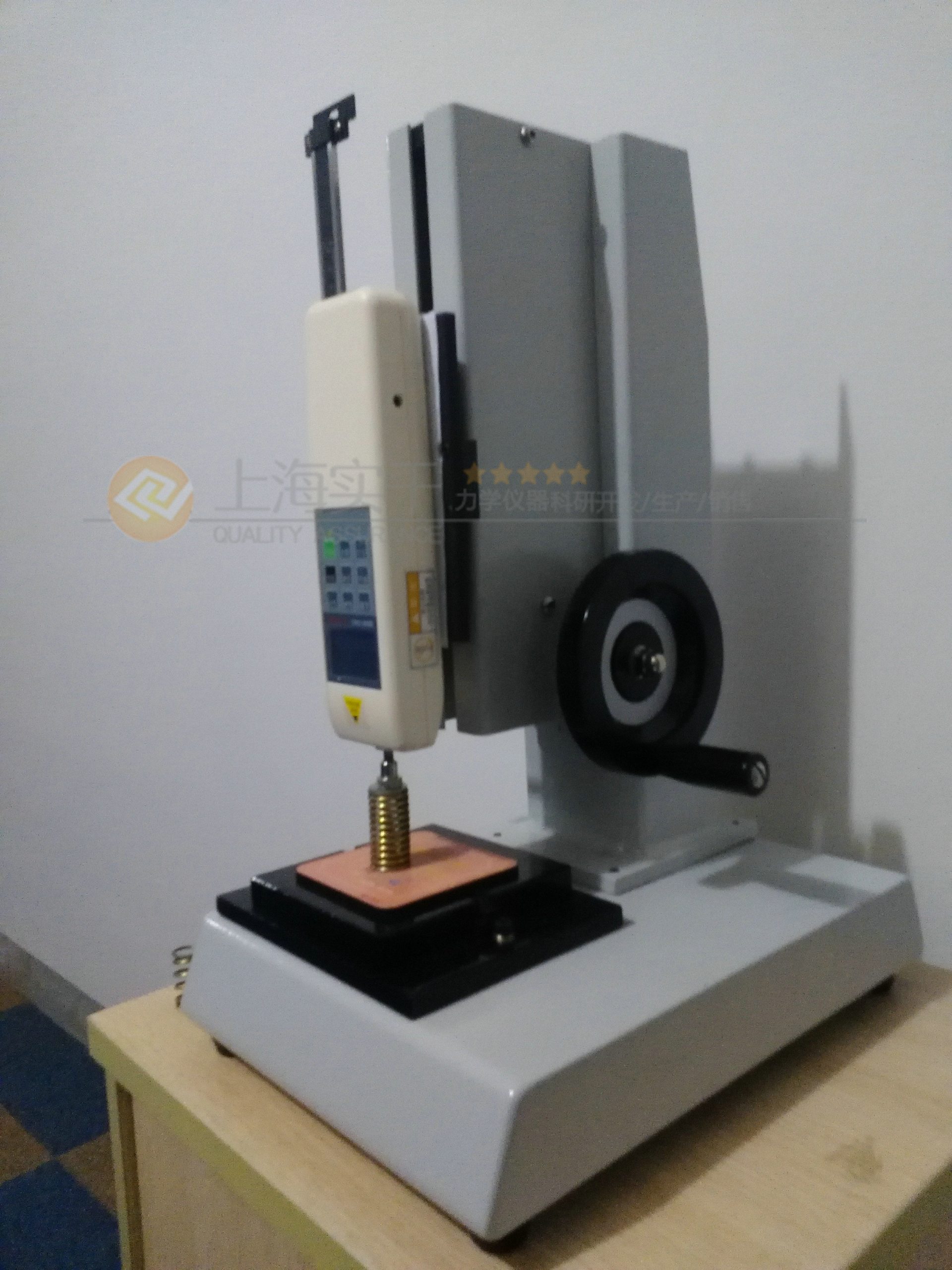 (4)安裝好推拉力計表后,用M4內(nèi)六角扳手將測力計安裝板重新安裝到機架上面。根據(jù)所需測試的樣品特點,將其機臺安裝或安放在工作臺上合適的位置。旋轉(zhuǎn)測試架側(cè)面的手輪,測力計就能上下平穩(wěn)移動,完成測試工作。?